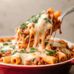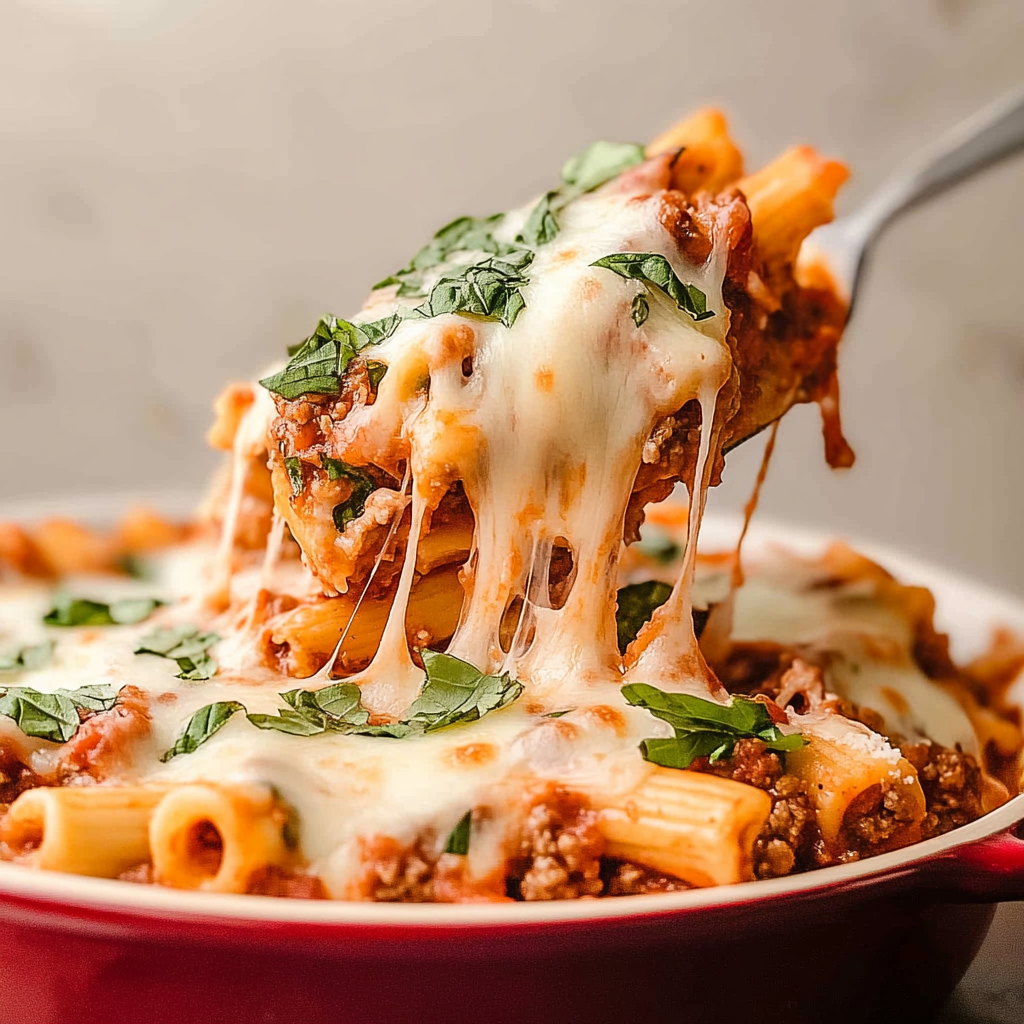 This comforting baked ziti is layered with hearty ground beef, gooey cheese, and rich tomato sauce, making it the perfect dish for family gatherings or cozy nights in.