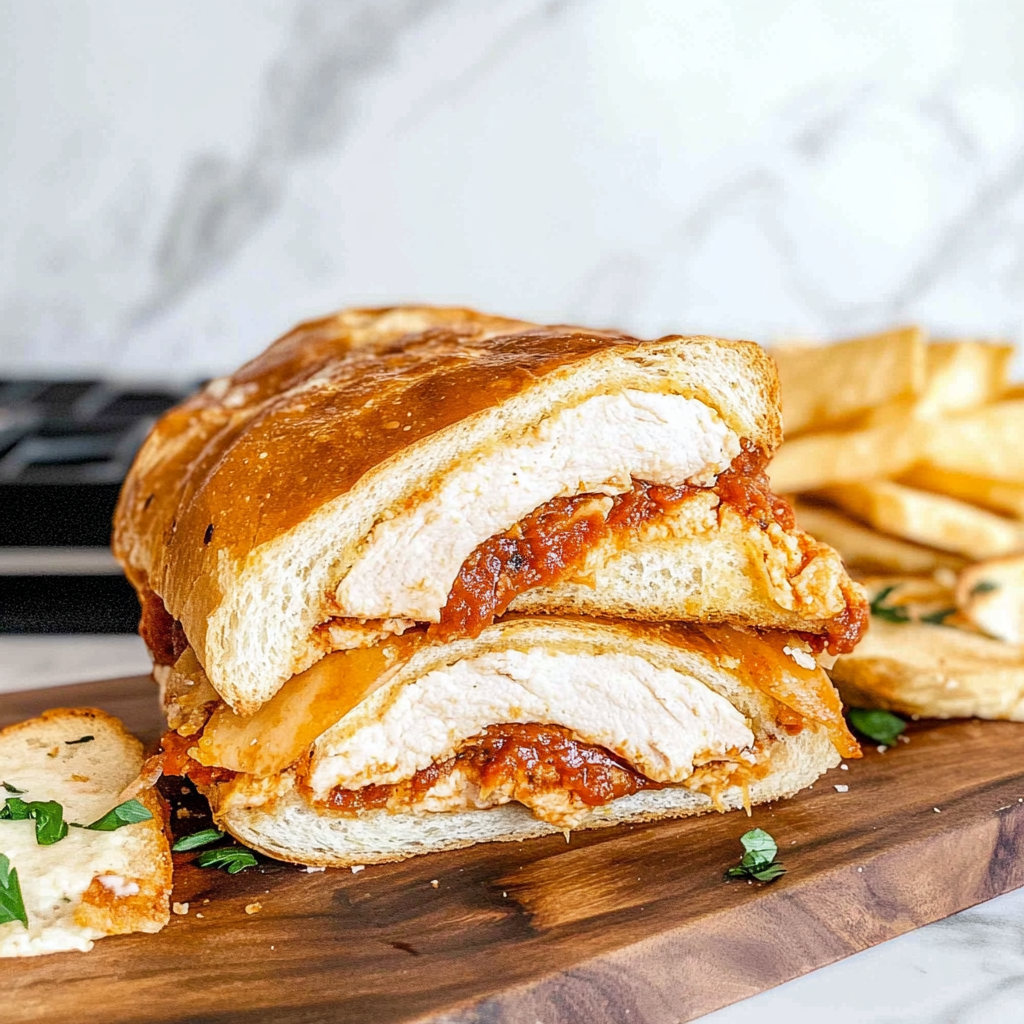 The Chicken Parm Sandwich is an irresistible blend of flavors wrapped in crusty bread. With seasoned chicken breasts topped with rich marinara sauce and gooey cheese, this dish is sure to please anyone at your table. Preparing it can be straightforward and customizable based on your preferences. Whether you make it ahead or enjoy it fresh from the oven, this sandwich brings comfort food to another level—perfect for any occasion!