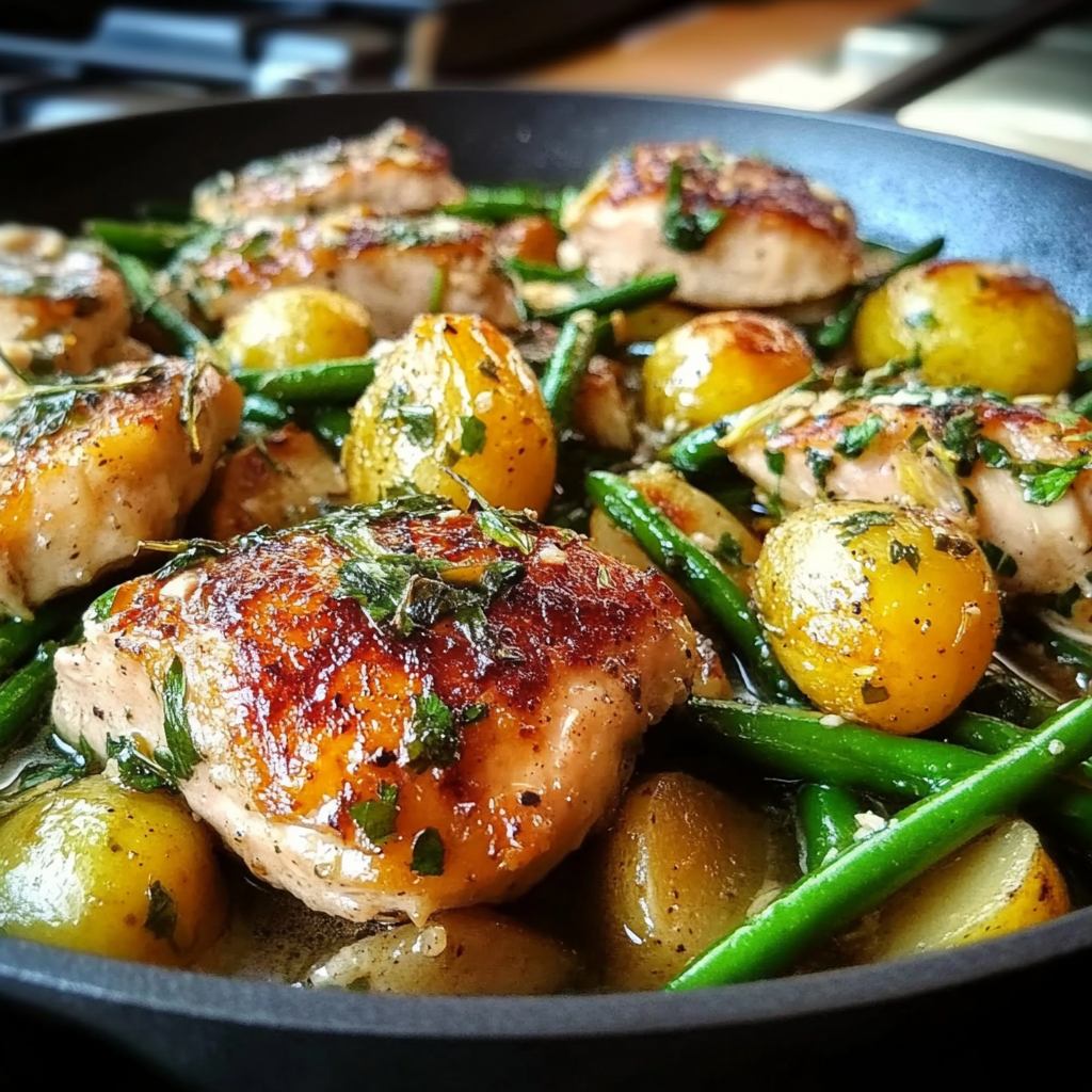 Savor the comforting flavors of tender chicken, creamy potatoes, and vibrant green beans in this easy one-pan meal that’s perfect for busy weeknights.