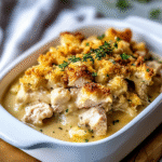 This Chicken Stuffing Bake features tender chicken, savory stuffing, and gooey cheese, creating a heartwarming meal that unites the family around the table.