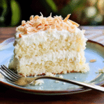 Indulge in a slice of moist coconut cake, layered with creamy frosting and crowned with toasted coconut. Perfect for any occasion, this dessert is a tropical delight!