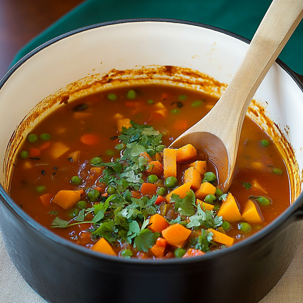 Now comes the magic! Pour in enough vegetable broth to cover all those beautiful veggies—about four cups should be plenty. Bring it to a gentle boil then reduce heat and simmer uncovered for about fifteen minutes or until sweet potatoes are tender.