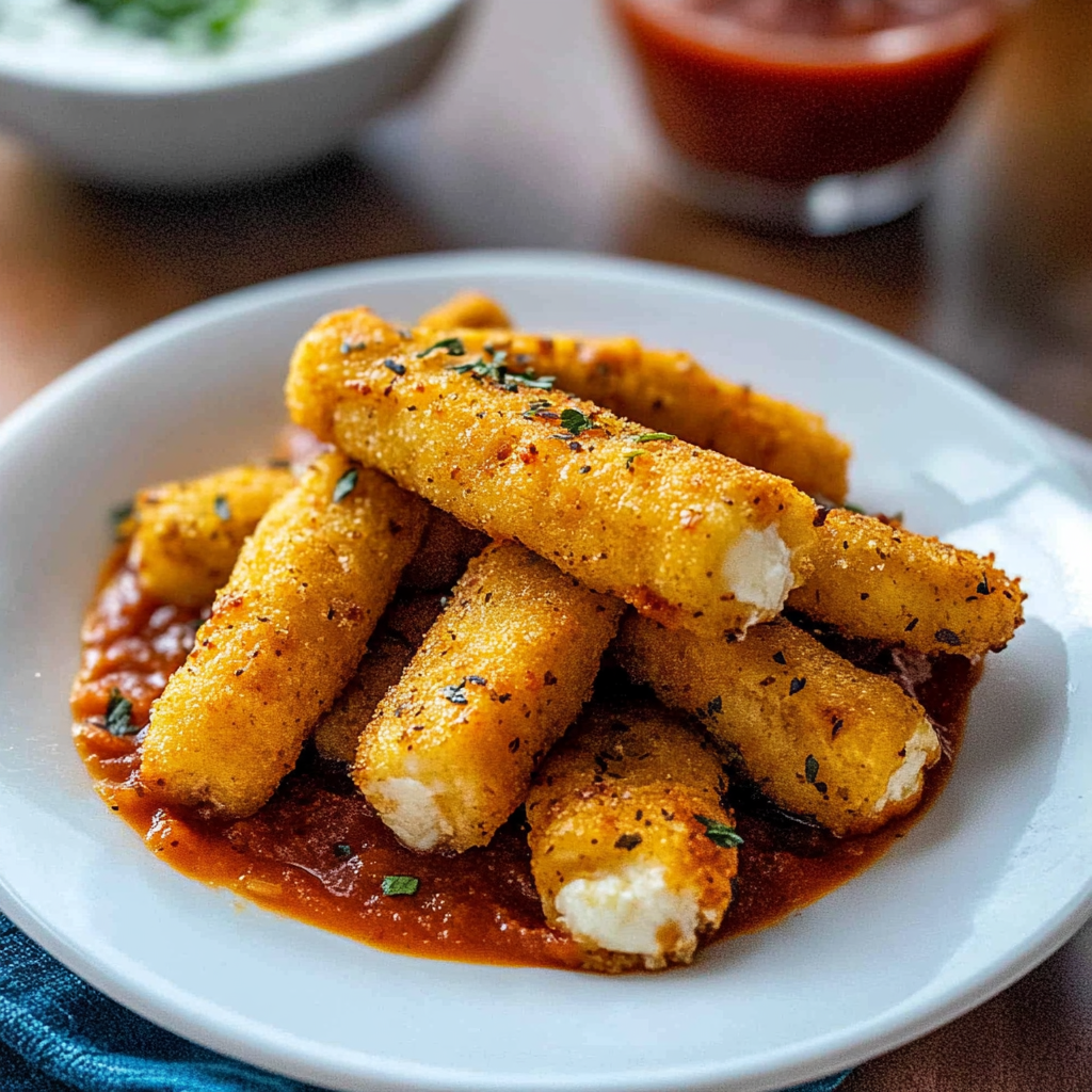 Start by preparing your ingredients: cut the mozzarella into sticks, then set up your breading station with flour, eggs, and breadcrumbs. Dip each cheese stick in flour first, then egg, and finally breadcrumbs before frying them for that golden perfection.