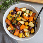 - In a large mixing bowl, toss the chopped vegetables with olive oil, salt, black pepper, rosemary, and thyme until well coated.