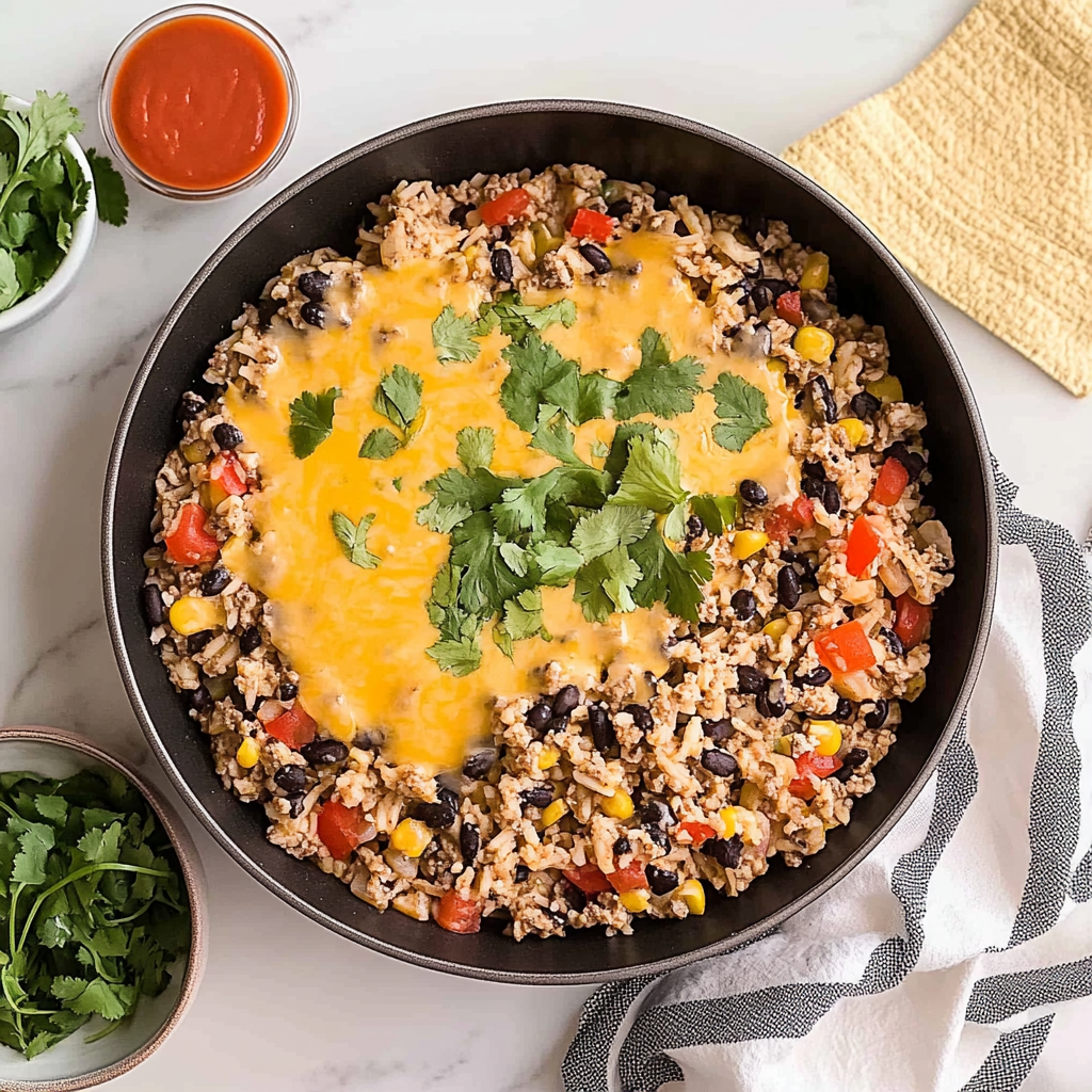 A cheesy, hearty dish that combines savory ground beef, fluffy rice, and zesty spices, perfect for busy weeknights or family gatherings.